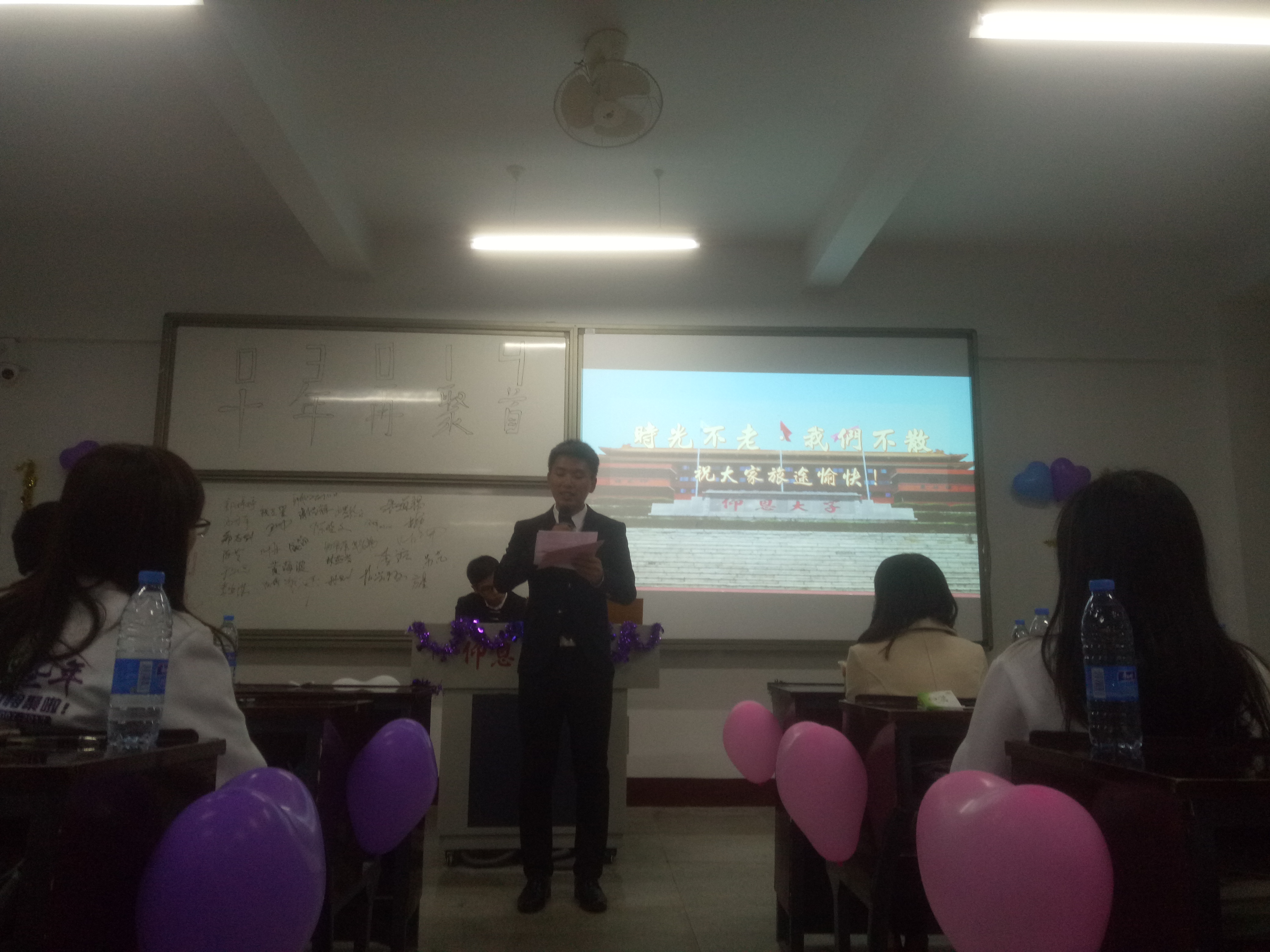 终于,伴随着上课铃声的响起,大家期待的学生时代的班会课活动开始了。吴晓伟老师开始了点名,一声声爽朗的答“到”触动了大家阵阵回忆涌上心头。精心制作的ppt播放着因特殊原因未能到场的校友送来的祝福更是唤起校友们旧时的回忆,感悟着彼此十年来的变化。“忆拾同学少年”、“时光机明信片”、趣味颁奖环节使得现场温馨一片,其乐融融。