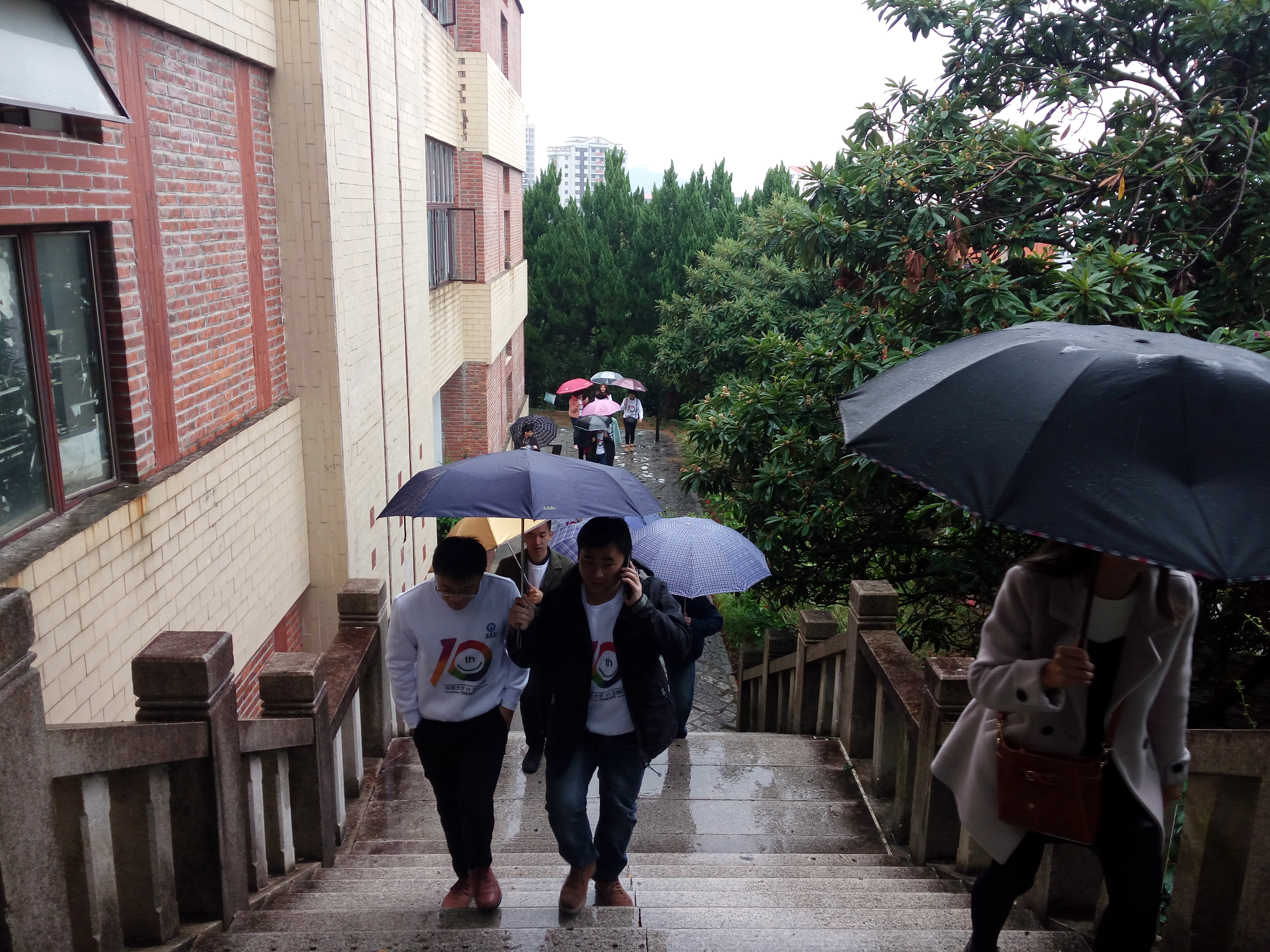 上午11点,2003级金融4班的校友们抵达第一教学区,“重走校园路”让校友们对大学时代的点滴生活感慨不已。在学院干部干事的带领下,校友们来到了学校的创业园进行参观。学长学姐们为母校蒸蒸日上的发展感到骄傲,也为学弟学妹们积极向上响应创新创业政策并取得不错的成果感到自豪。随后,校友们又沿途重游了宏船楼、泽钏楼、图书馆普照楼等各个母校的角落,虽然是淅淅沥沥的雨天,却抑制不住校友们内心的欣喜和激动。