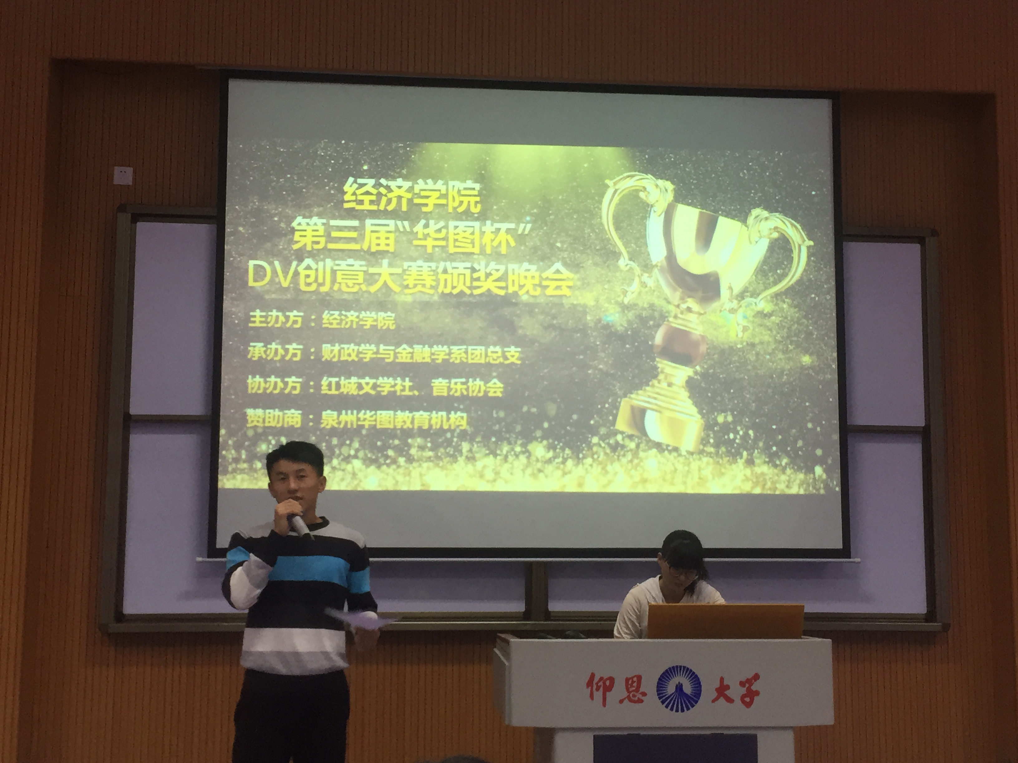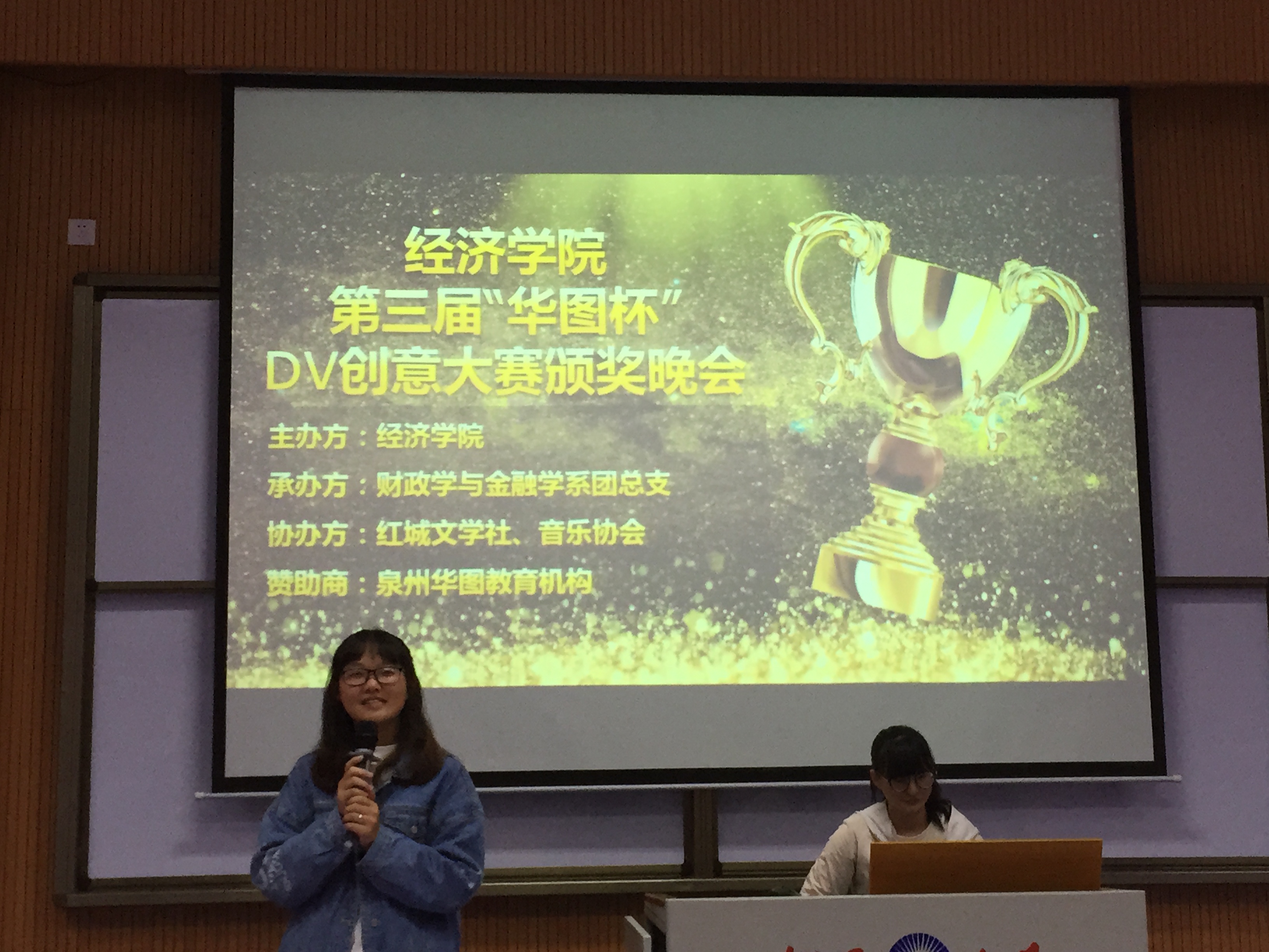 1126日晚7点,由yl23455永利集团主办、财政学与金融学系团总支承办、红城文学社及音乐协会协办的yl23455永利集团第三届“华图杯”大学生DV创意大赛颁奖晚会在和昌楼博雅讲堂圆满举行。yl23455永利集团团委书记陈建鑫、学生会指导老师林珊珊、财金系团总支书记赖桂全、团委干部及全体团总支副书记出席现场,特邀嘉宾泉州华图教育机构咨询师康汉景老师作现场点评。