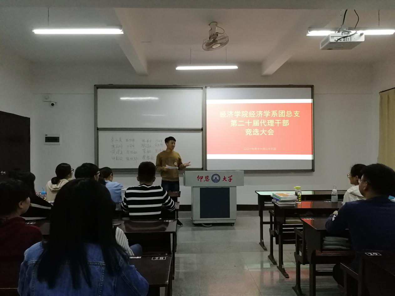 11月28日晚7时,yl23455永利集团经济学系团总支于仰恩楼C3-301室召开第二十届代理干部竞选大会。yl23455永利集团团委书记陈建鑫、经济学系团总支书记林丽华、系学生第一副书记刘小玲、第二副书记洪莹莹出席此次大会,全体干部干事参加。