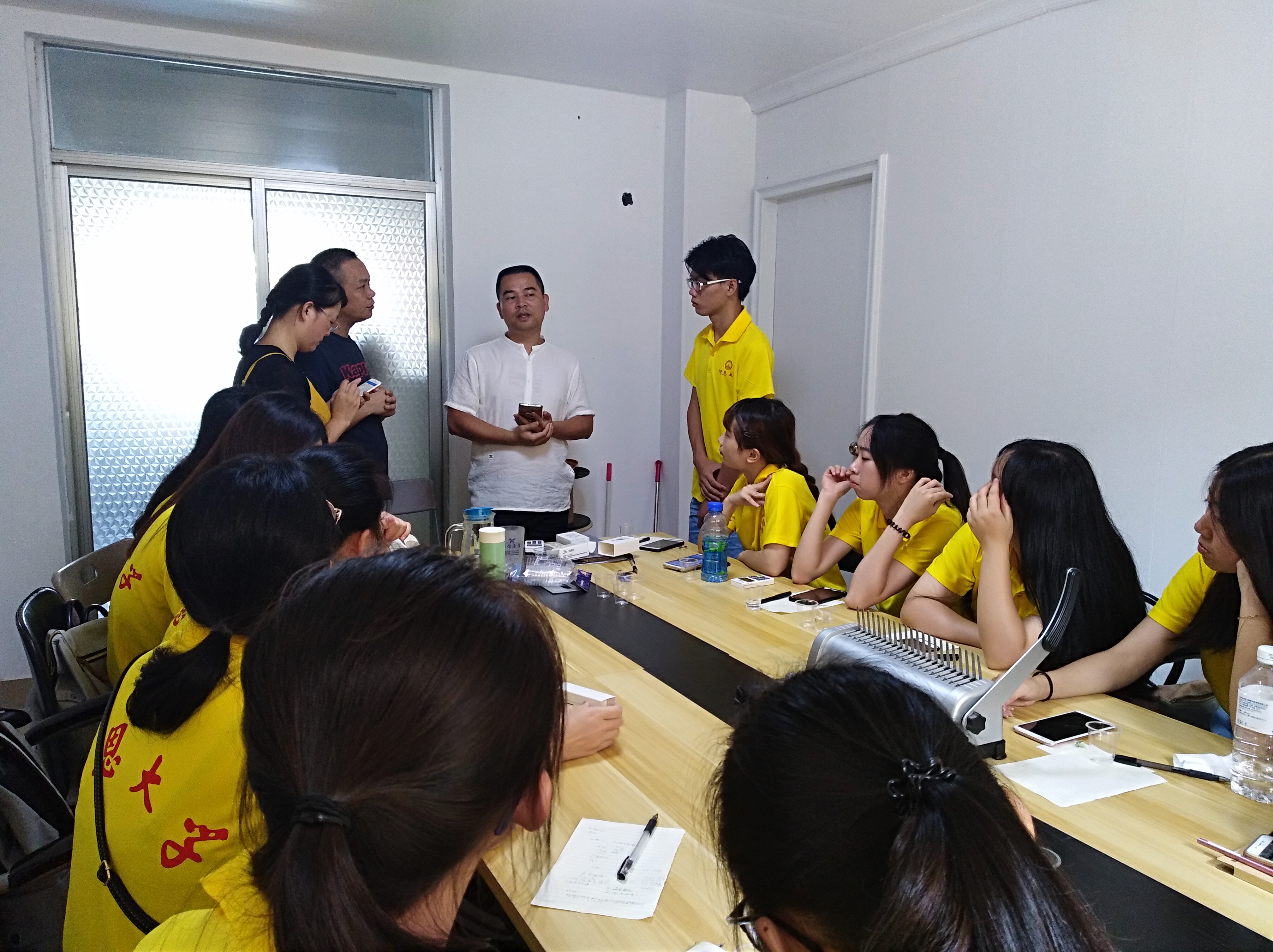 实践队一行人到达智文网络技术有限公司王经理热情接待实践队员分享以往个人经历,公司成立发展概况及主要业务情况。队员们根据工作特性需要分三组,王经理及公司合伙人针对团队建设、目标规划及规划安排进行培训期间,实践队员们及时提问队伍创建过程中遇到的组建、技术难题,王经理耐心答疑解惑