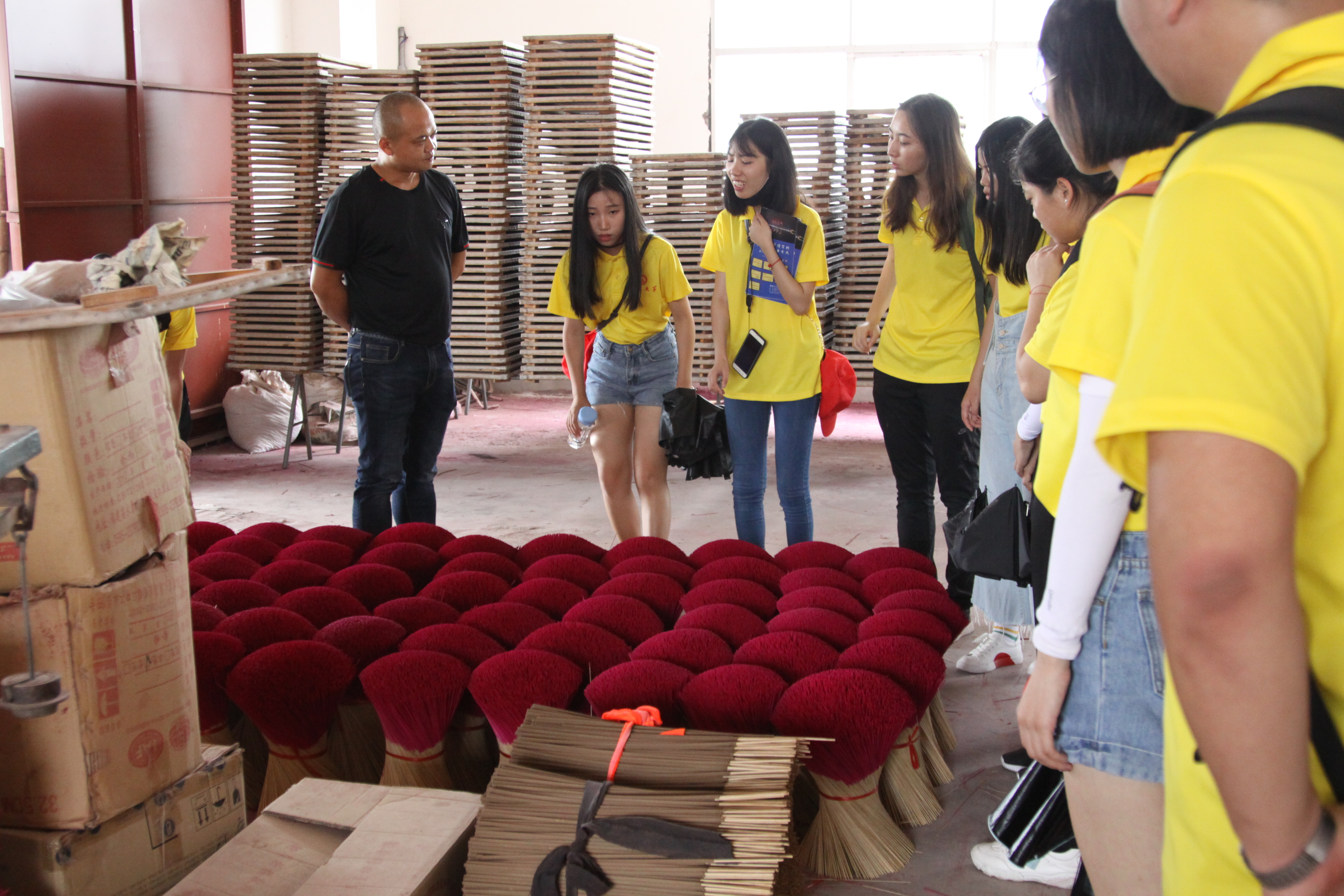 (图为林金泽经理亲自带领实践队员参观制香工厂)