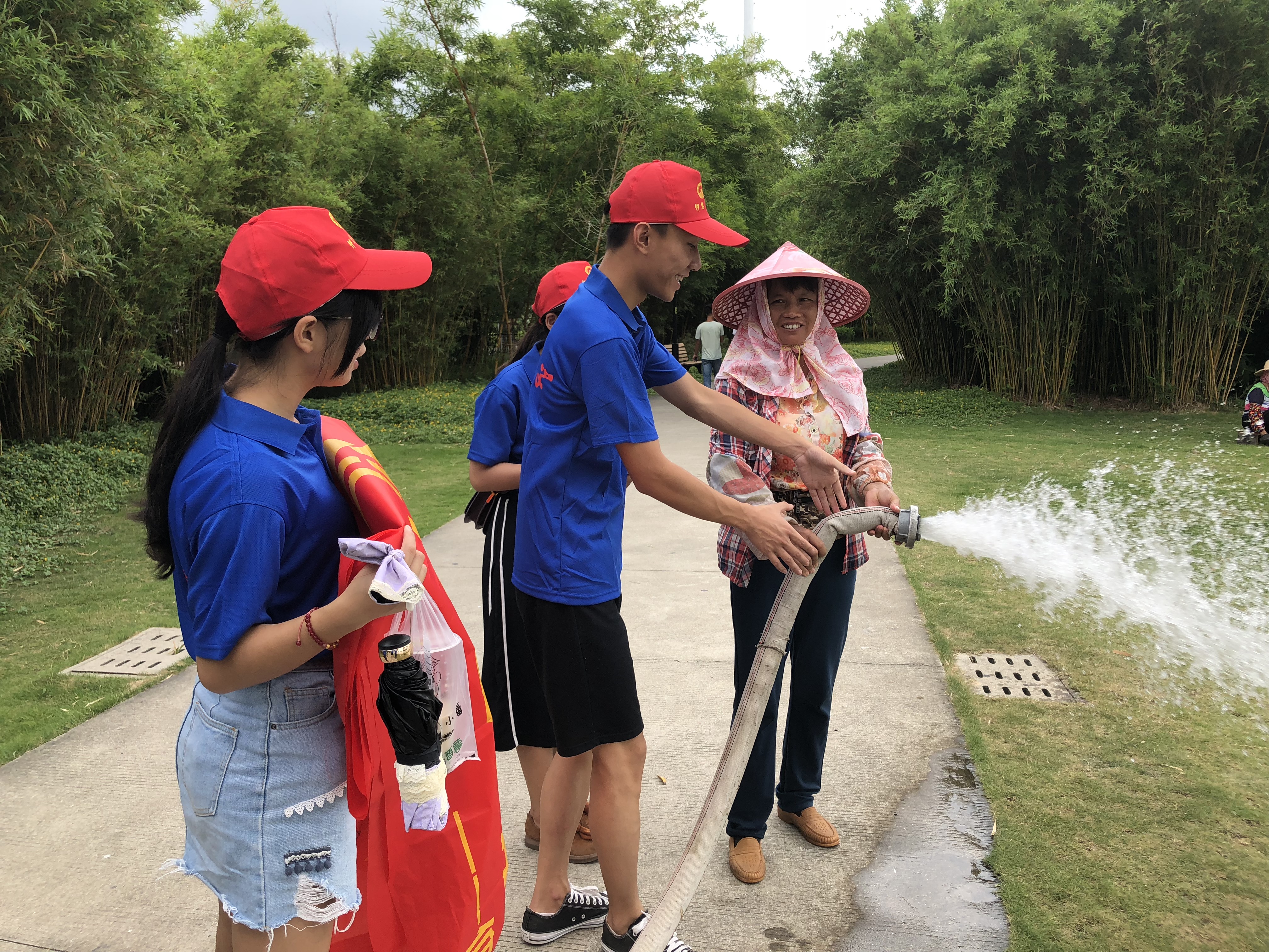 (图为队员们为绿化人员送上爱心之水)