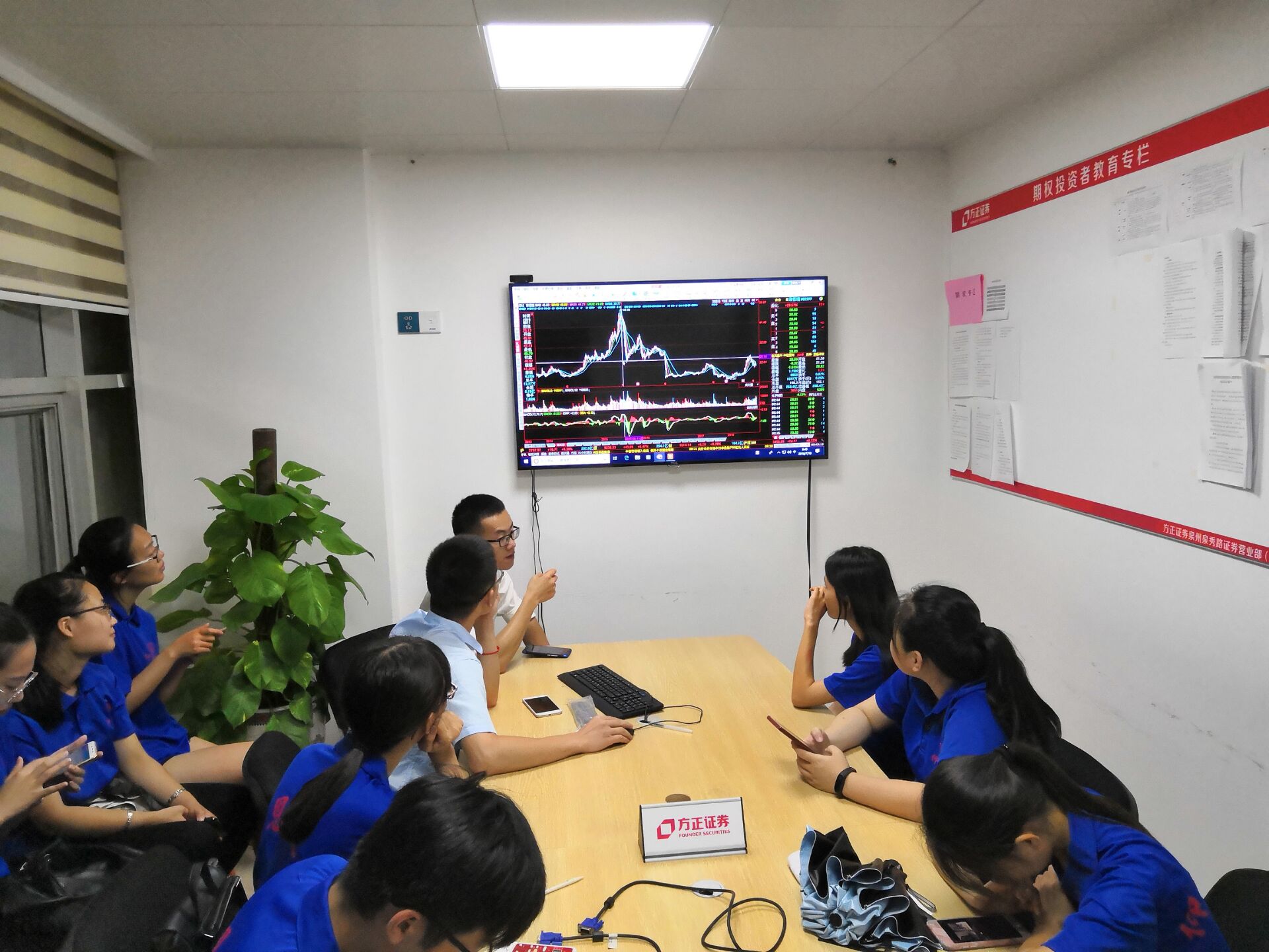 在两位工作人员的指导下,实践队学习了解了证券的相关基础知识以及对股市大盘走势图的分析。其中他们还谈起了他们对大牛市的预测,尽管在现在中美双方打起贸易战的情况下股票市场并不景气,但他们始终相信在证券投资这一块未来的市场还是很值得期待的。而后,他们又实践队提出了相关问题,使得实践队将所学知识融会贯通。