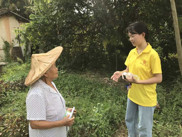 刚到蜜柚园,实践队员仔细观察了蜜柚的形状大小,以及周围的生长环境。队员发现地上长着杂草,农民解释,果园生草有利于增加病虫天敌的种类和数量,以此保护柚树的生长。队员们还了解到了红蜘蛛是危害蜜柚的病虫之一,过去主要靠打药来防治虫害,现在主要靠其天敌来防红蜘蛛。最后,为让当地的农民对种植蜜柚的知识有系统性的了解,队员们将一本蜜柚种植书籍赠送给当地居民,希望能对农民的种植有一定的帮助。