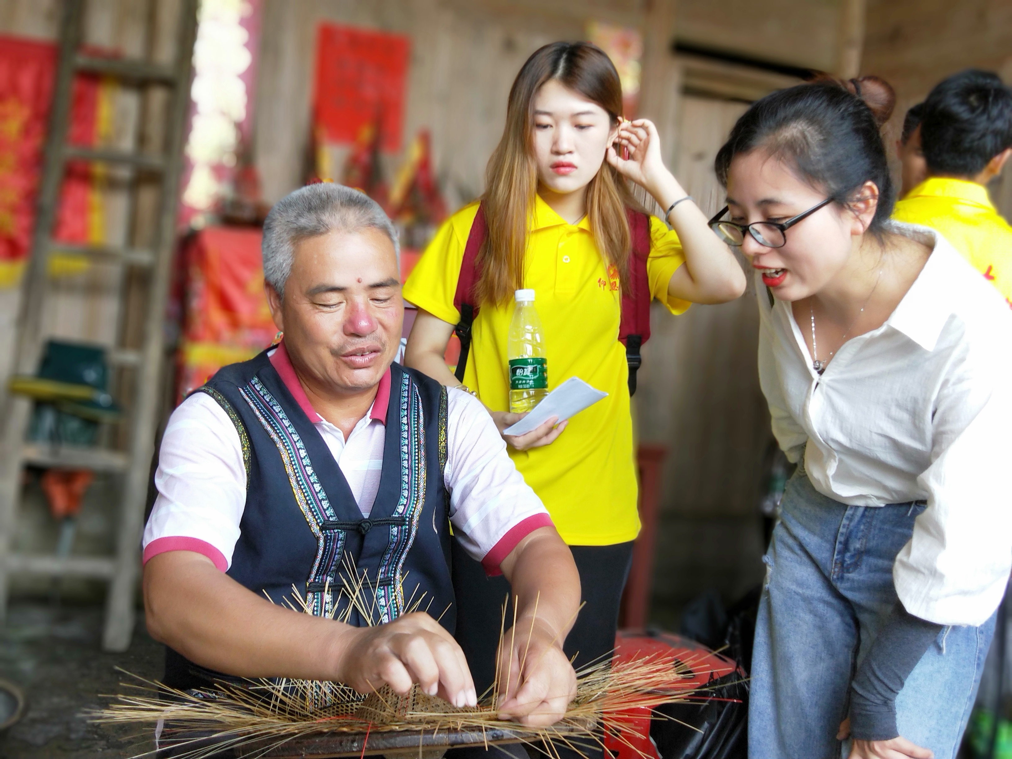 在霞浦县崇儒畲族乡团委的带领下,指导老师赖桂全与实践队队员来到了编花斗笠传承人吴孙存师傅家,吴师傅为实践队示范了花斗笠的编法,以及展示了一些花斗笠的半成品。在吴师傅的介绍下,实践队得知一顶花斗笠的价格是500左右,主要用于一些文工团的服装或者展览。而存在的问题是传授花斗笠的技艺时间有限,子女都在外地打工。随后,实践队还与仰恩选调生陈华妹学姐进行关于畲族文化的发展与继承的交流,了解更多当地的文化与特色。