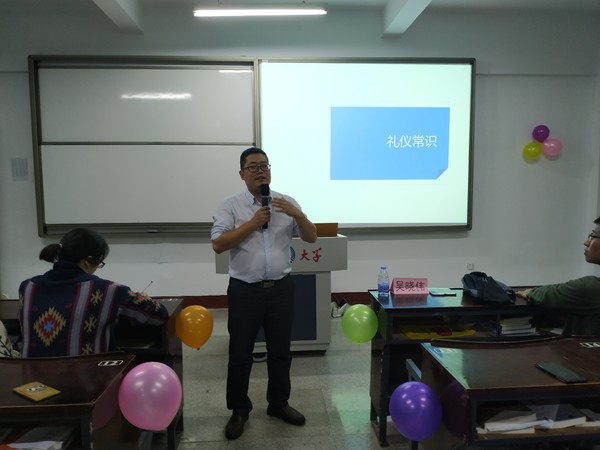 第二阶段为新生班委能力提升培训活动,活动旨在提高新生班委班级建设意识及个人成长意识。11月1日晚七点半,本次培训邀请党总支书记吴晓伟和优秀学生干部代表曹聪伟为新生班委主持。吴晓伟老师以“把握细节,成就人生——学生干部礼仪”为主题,从学生干部着装礼仪、日常交往礼仪、仪态礼仪、商务餐饮礼仪四个方面进行讲解。吴老师幽默风趣的讲解引起新生们的欢声笑语,使得知识变得通俗易懂。随后,曹聪伟以“如何建设班级”为主题,从班级班委的职责分工到班级活动的举办,用实例为新生班委的班级建设提供经验。活动尾声,吴晓伟对本次活动进行总结。