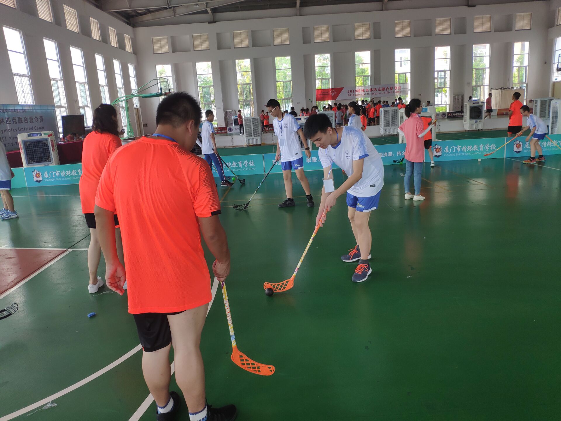 开营仪式上,各学校代表相继进行特奥融合学校签约与发言,所后进行了运动员代表和裁判员代表的宣誓,宣誓完毕后,“特殊奥林匹克融合夏令营”正式拉开序幕。随后,旱地冰球训练依计划举行,实践队中的九名队员按照原定安排协助特校老师对学员进行了引导,四名队员则以“融合伙伴”的身份与学生们进行了特奥旱地冰球和MATP机能训练。