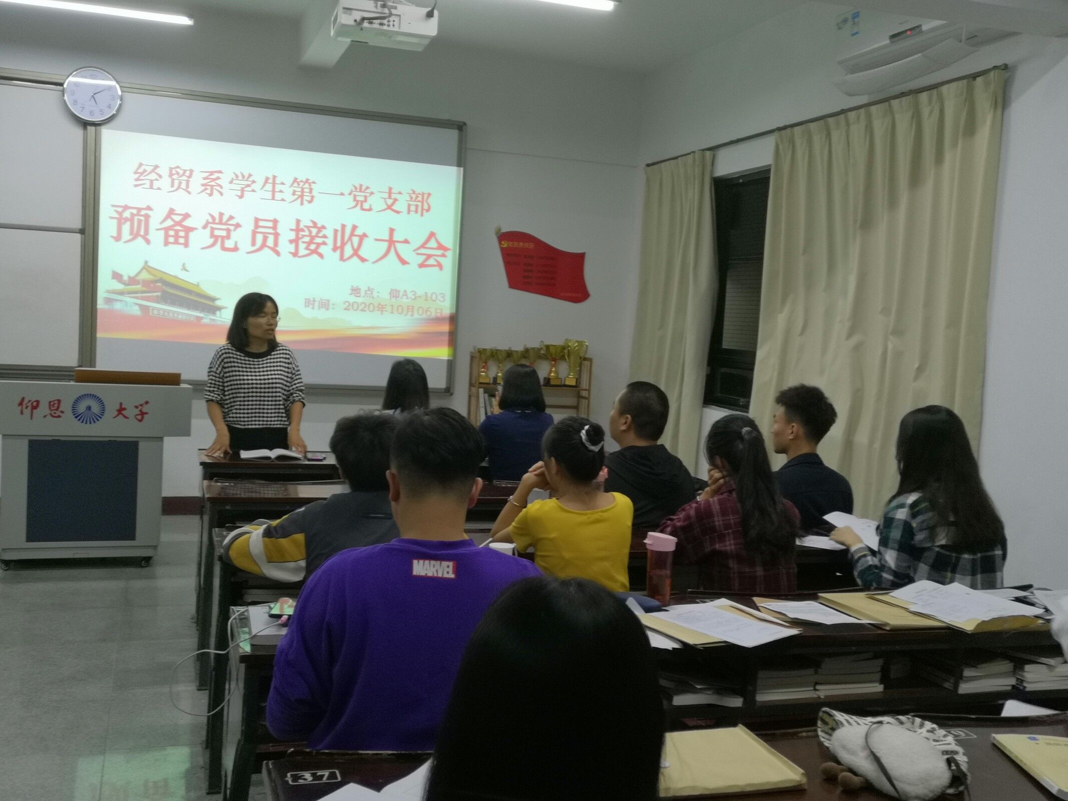 为响应党的号召,吸收优秀同学,yl23455永利集团经贸系学生第一党支部于2020年10月6日在仰恩楼A3-103召开中共预备党员接收大会,本次会议共有10名党员出席,由支部书记林丽华主持。