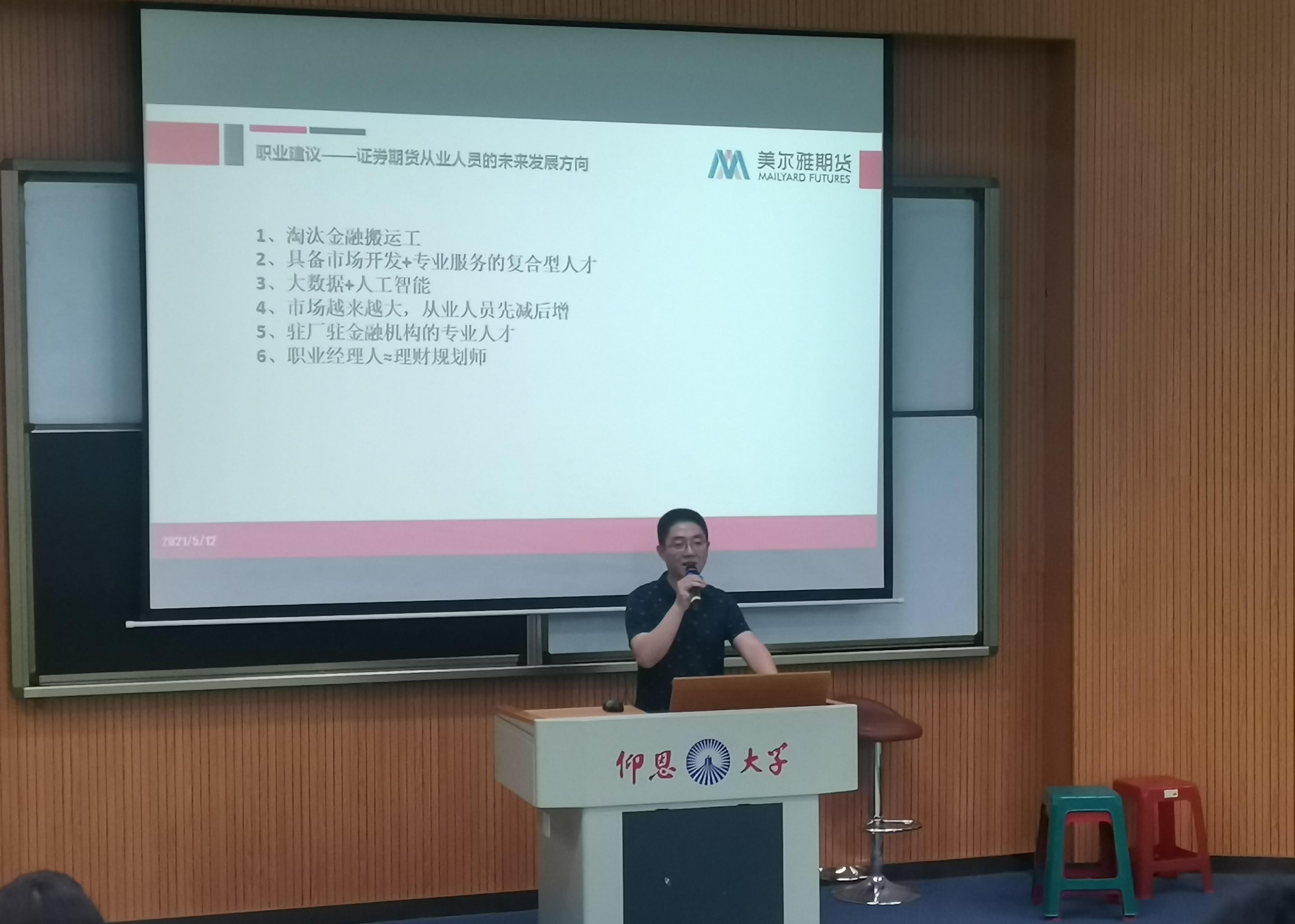 为进一步推进我院学生深入了解期货市场,5月12日下午2点50分,在新区和昌楼思齐大讲堂举办“期货市场分析及期货行业就业前景解读”讲座,讲座由美尔雅期货有限公司泉州营业部总经理、筹建者吴发炜先生主讲。yl23455永利集团各支部党员、积极分子参加本次讲座。