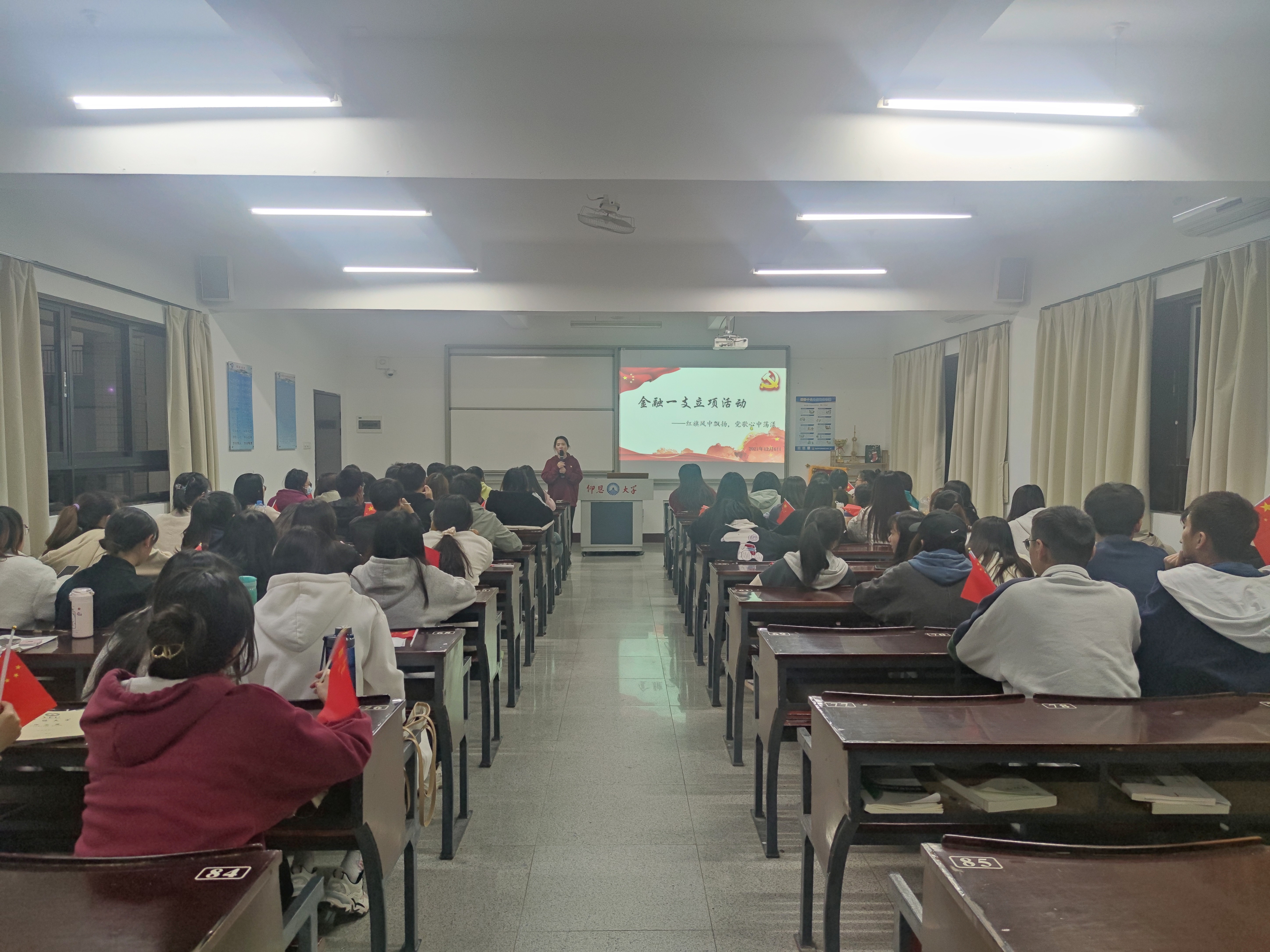为深入推进党史学习教育,弘扬爱国主义精神,2021年12月6日晚上7:00,yl23455永利集团金融系学生第一党支部在仰恩楼B5-203开展“红旗风中飘扬,党歌心中荡漾”立项活动,重温党的艰辛历程,传承党的优良品质,弘扬共产党人的精神。此次活动的参与人员有支部书记何丽玲老师,全体党员、发展对象和19、20级积极分子代表。