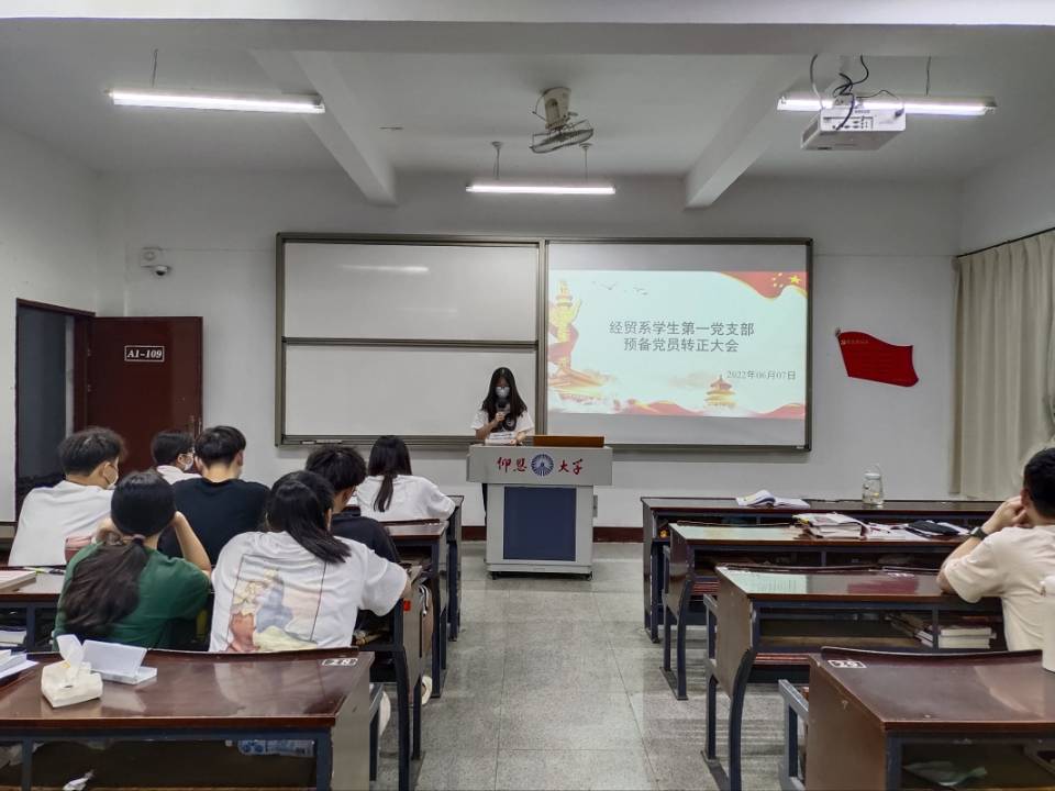 2022年06月07日,经贸系学生第一党支部于仰恩楼A1-109教室召开了预备党员转正大会。参加此次会议的有经贸系学生第一党支部全体党员。