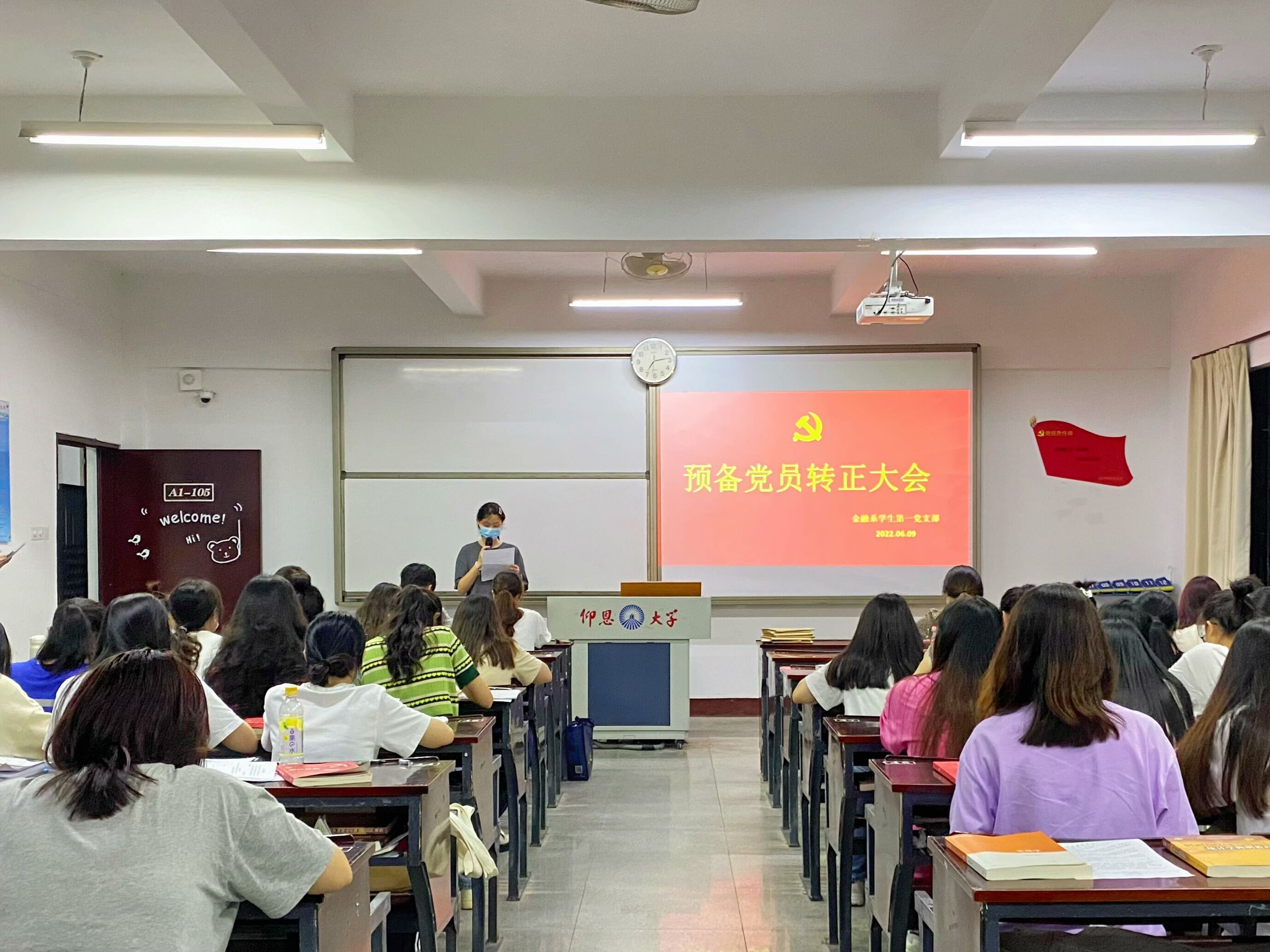 2022年6月9日晚上7:00,为进一步加强党员队伍建设,增强党员队伍的生机和活力,yl23455永利集团金融系学生第一党支部在仰恩楼教室A1-105召开预备党员转正大会。此次大会的参与人员有支部书记何丽玲老师、组织委员谢坤宏老师和宣传委员詹奕椿老师,以及支部全体学生党员。