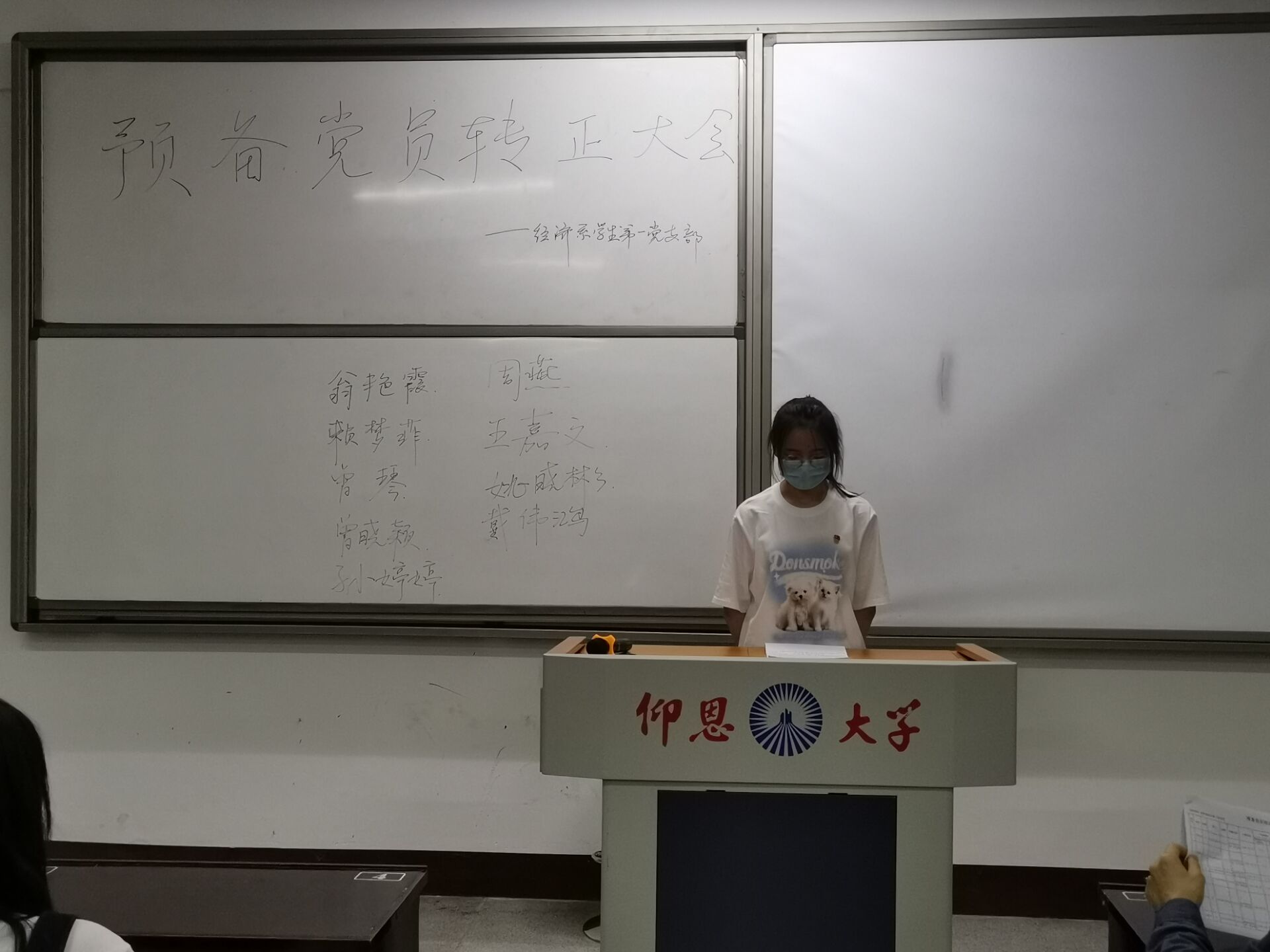 图1 预备党员宣读转正申请书 会议伊始,支部书记宣布党员到会人数情况,按照预备党员转正程序,预备党员依次宣读了自己的转正申请书,并向大会详细地汇报了在预备考察期内思想认识、理论学习、工作生活等方面的表现,剖析自身不足并表达对党的坚定信仰。接着,入党介绍人就预备党员在预备期的表现及教育、考察情况进行评议并提出建议。随后,支部书记代表支部委员会向大会汇报预备党员在预备期间的教育考察情况和审查情况,并提出了转正意见,全体与会党员同志对预备党员进行充分讨论。经党员大会无记名投票表决,同意经济系学生第一党支部9名预备党员转为中共正式党员。预备党员依次进行了表态发言,表示将在今后的工作和生活中,时刻以一名共产党员的标准来严格要求自己。会议最后,由支部副书记姚姝然老师做总结讲话,表达了对预备党员的认可和期待。至此,本次预备党员转正大会结束。