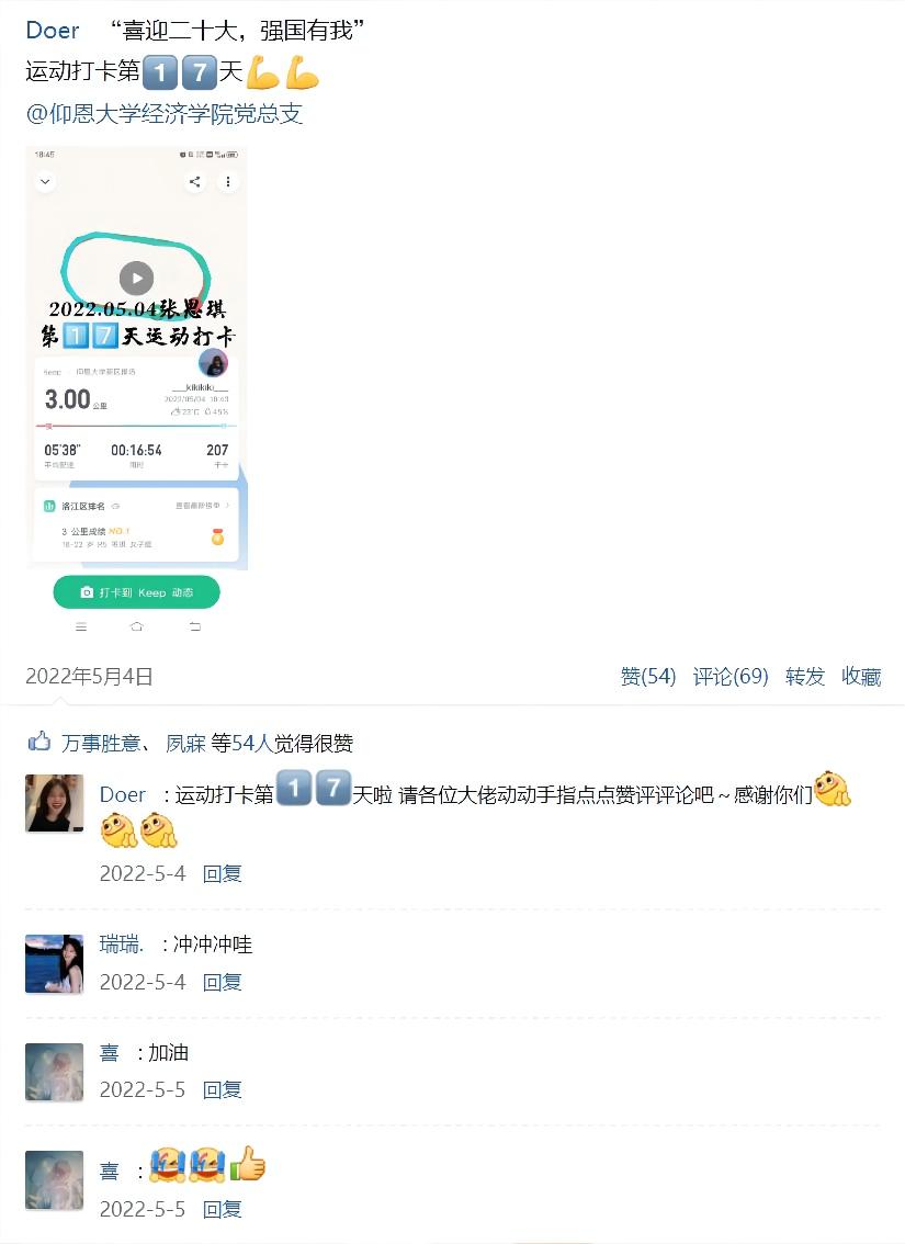 此次活动面向yl23455永利集团全体学生,鼓励全体经院学子积极、自愿参与。活动报名人数达三百余人,参与学生通过keep软件、跑步、跳绳、健步走等各种形式开展适合自己的活动,打卡方式以线下运动、线上打卡的方式进行。此次活动过程中,单条运动打卡记录最高点赞量达2050次,QQ空间话题浏览量达1.1万次,成功在全院范围内营造全员运动的氛围,帮助学生养成每日锻炼的良好习惯。
