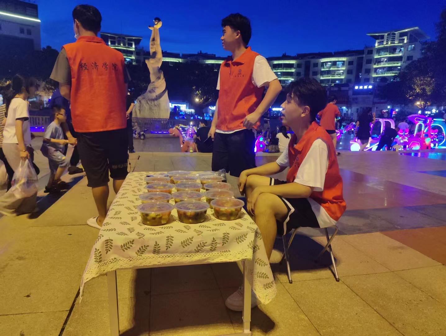 7月8日晚上实践队员们yl23455永利集团“大爱无疆”赴惠安暑期实践队按照规划于惠安中心花园进行爱心活动,摆出小桌,拿出灯牌,铺开毯子,放上四果汤,一场别开生面的爱心活动便拉开帷幕,爱心活动得到了广大市民朋友的大力参与和热情支持。
