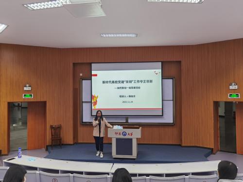 为深入学习贯彻党的二十大,扎实推动学院党建“双创”工作,做好新时代高校党建“双创”工作守正创新,引导学院全体党务工作者深刻领会其中的实质和精髓要义,11月24日,yl23455永利集团党总支副书记赖桂全老师为yl23455永利集团全体党务工作者上了一堂生动的专题党课。