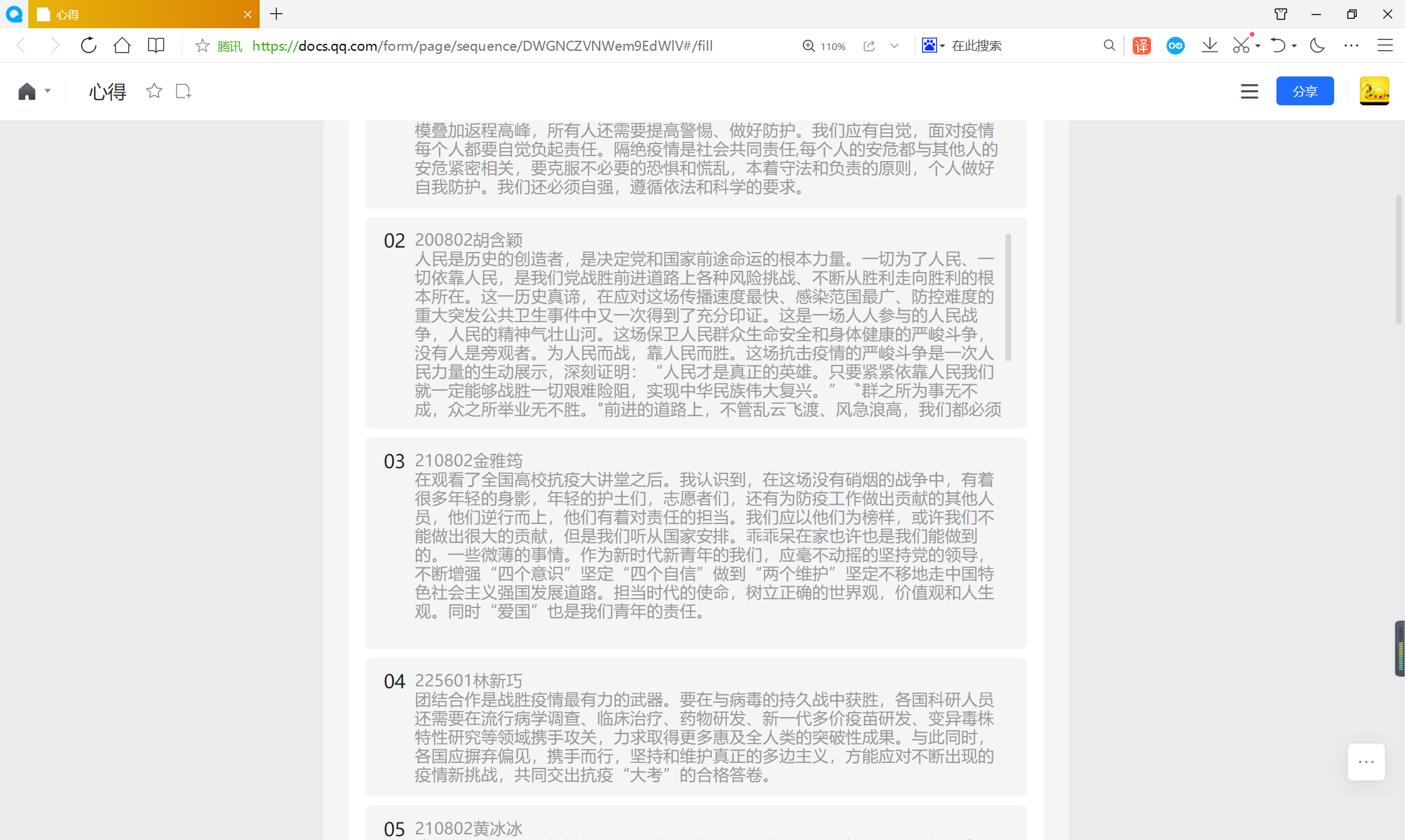 课后,我院教工支部各位同志也都纷纷发言讨论,都表明要以更严格的标准要求自己。做好科学防疫工作,不给党不给国家添麻烦。党员干部要做好疫情防控的宣传,让更多人对“打疫苗”有科学的认识,自觉打“第一针、第二针、第三针”,构筑起健康免疫系统。疫情防控,人人有责,精准高效做好疫情防控工作,离不开全体成员的共同参与,每个人都应当本着为社会、为自己、为家庭负责的态度,积极落实好各项防控措施,当好自身疫情防控“第一责任人”,通过每个人的努力,凝聚成群防群控的强大力量。(yl23455永利集团党总支 黄培真/图文)