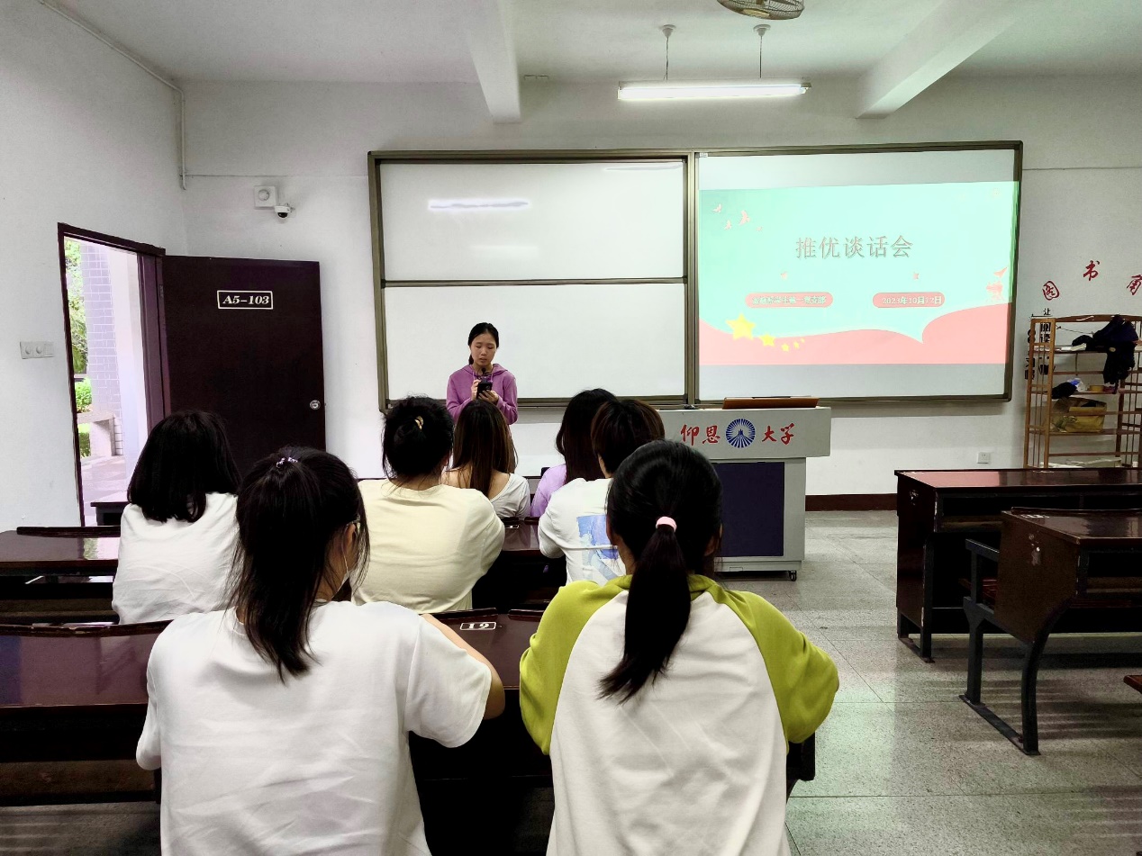 入党积极分子是党员队伍的后备军。了解入党推优对象的个人情况,考察其入党决心和态度是确定入党积极分子工作的基础和前提。为进一步教育引导广大团员青年积极向党组织靠拢,不断提升思想认知和政治觉悟,2023年10月09日下午,yl23455永利集团金融系学生第一党支部在仰恩楼A5-103组织新一批入党推优对象开展谈话会。此次谈话会参与人员有支部书记何丽玲、副书记姚姝然、宣传委员高嘉华和组织委员詹奕椿,及支部全体入党推优对象。