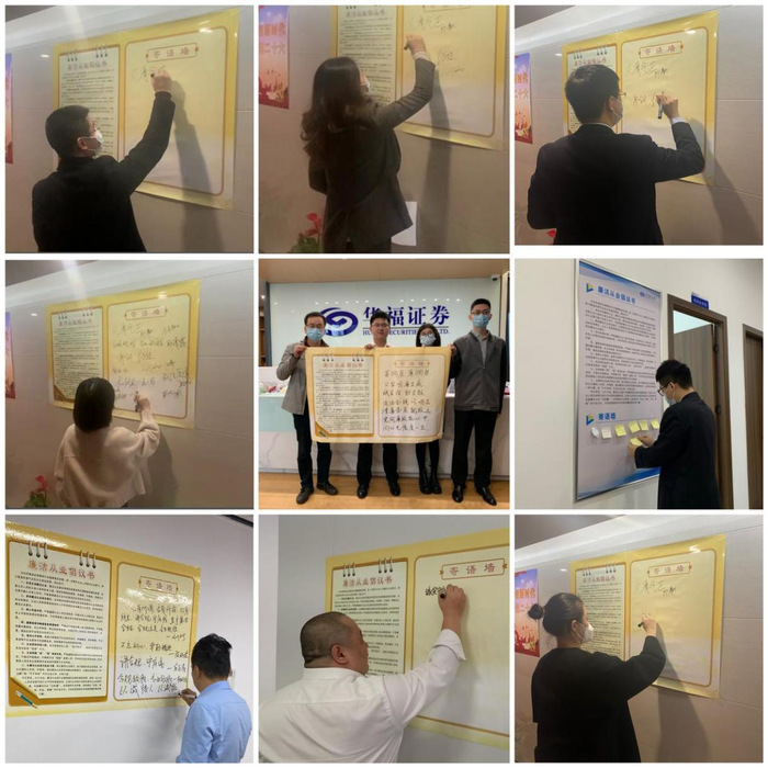 2.内外同频共建学廉倡廉好风尚。携手本地银行等金融机构共同深入当地重要规模性企业发放《廉洁从业告知书》,宣讲清廉金融文化,取得一次宣讲,辐射多人的效果。2022年9月以来累计开展15场活动,发放超近200份《廉洁从业告知书》;在各营业部柜台放置并主动向客户发放《廉洁从业告知书》,宣传“清廉华福”形象,获得客户认可;向员工家属发放《廉洁倡议书》,让廉洁企业文化带动廉洁家风建设,廉洁家风助力打造廉洁企业文化。