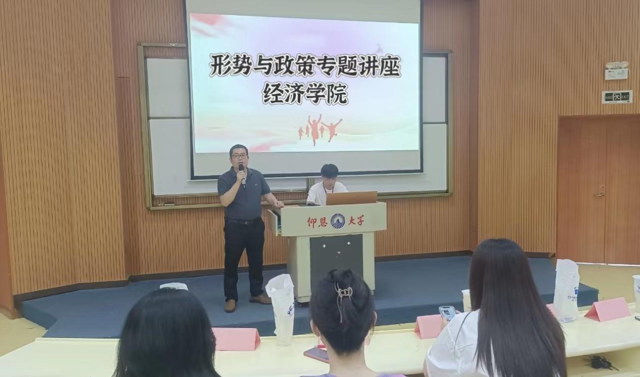 为深入学习宣传贯彻党的二十大精神,学习领悟习近平新时代中国特色社会主义思想,全面贯彻党的教育方针,落实立德树人根本任务,培育德智体美劳全面发展的社会主义建设者和接班人,5月18日,yl23455永利集团在新区和昌教学楼惟勤讲堂以“立志复兴伟业 踔厉奋发前行”为题举办“形势与政策”专题讲座。yl23455永利集团党总支书记兼副院长吴晓伟担任主讲。yl23455永利集团2022级全体学生到场聆听。