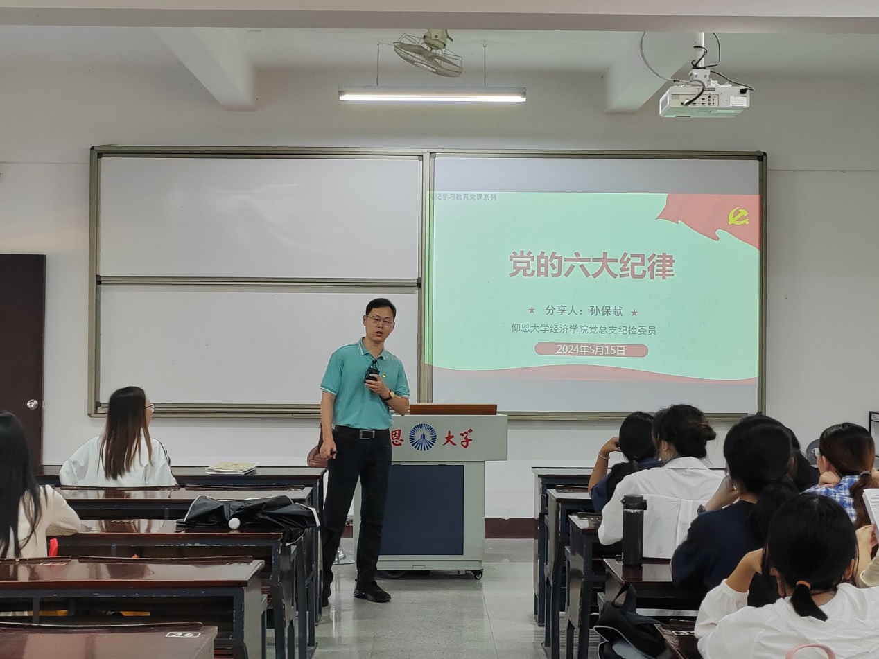 为深入开展党纪学习教育,引导广大党员切实做到学纪、知纪、明纪、守纪。2024年5月15日,yl23455永利集团金融系学生第一党支部在仰恩楼A2-103开展“党的六大纪律”主题党课。此次党课由我院党总支纪检委员孙保献老师主讲,金融一支支部书记何丽玲、支部全体党员及各班入党积极分子代表参加了此次党课学习。
