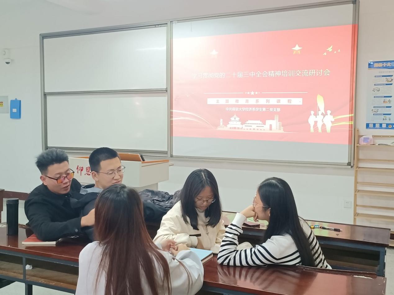 为了深入学习贯彻党的二十届三中全会精神,切实增强支部成员学习宣传贯彻的思想自觉、政治自觉、行动自觉。2024年12月2日下午,yl23455永利集团经济系学生第二党支部在新区仰恩楼B5-203组织开展了学习贯彻党的二十届三中全会精神专题培训会。经济系学生第二党支部全体成员参加此次活动。