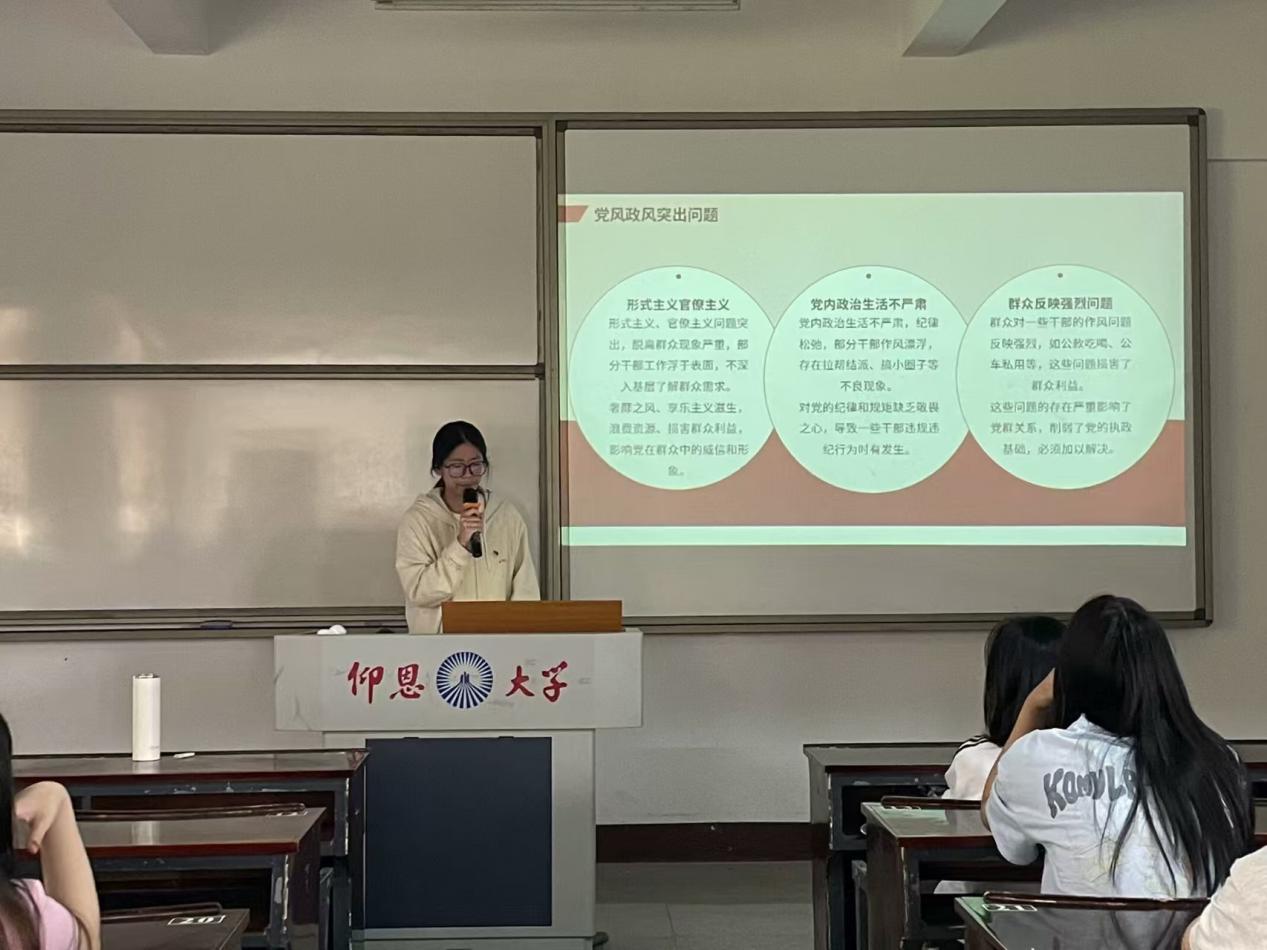 首先,王鸿燕同志通过PPT的形式与大家分享了她关于中央八项规定的学习领悟,指出中央八项规定是新时代推进党的自我革命的重大制度成果,是长期有效的铁规矩、硬杠杠。深入学习贯彻中央八项规定及其实施细则精神,对于加强党的作风建设、密切党同人民群众的血肉联系、推动单位各项事业高质量发展具有重要意义。紧接着,各班积极分子依次上台发言,积极分子陈阳丽同学提到,对各项条款进行了详细解读,并结合实际工作中的案例,深入剖析了违反中央八项规定精神的具体表现和危害。