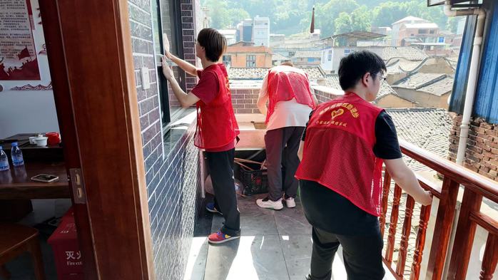 公共区域清洁小组的任务同样繁重。他们对养老院的走廊、楼梯、活动室、食堂等区域进行全面清洁。志愿者们有的手持长柄扫帚清扫天花板上的蜘蛛网,有的跪在地上用刷子刷洗走廊的地砖,有的爬上梯子擦拭高处的玻璃窗。面对走廊扶手、楼梯栏杆等容易藏污纳垢的地方,志愿者们更是用抹布反复擦拭,直至光洁如新。