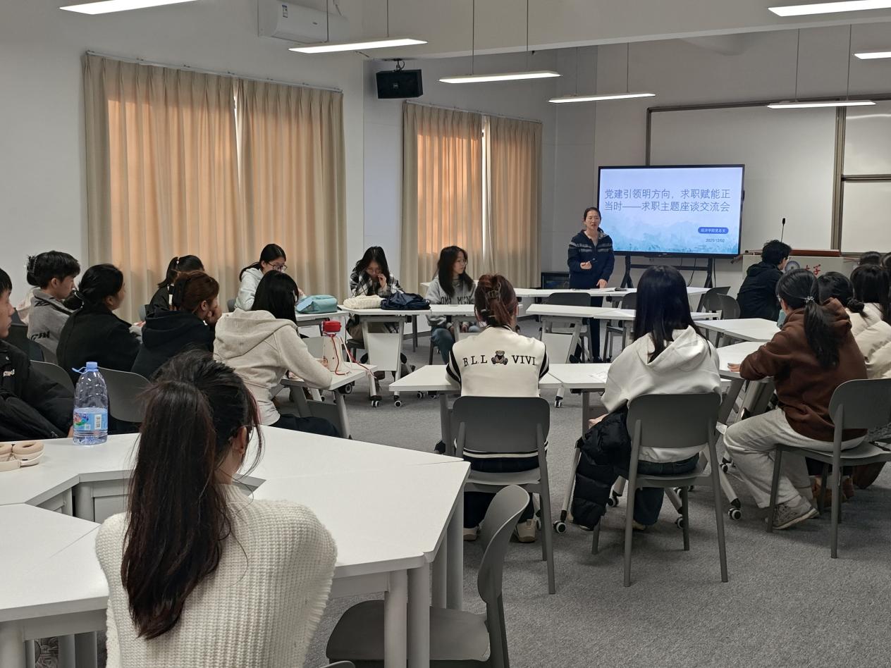为推动党建引领与就业服务深度融合,解决毕业班同学求职困惑,帮助明晰职业发展路径,12月2日下午16:00,yl23455永利集团党总支联合学生二支部、致远书院和宏船书院,在普照楼130组织开展“党建引领明方向,求职赋能正当时”求职主题座谈交流会,主要是求职心路历程与备考准备。活动由yl23455永利集团党总支组织员何丽玲老师现场指导。