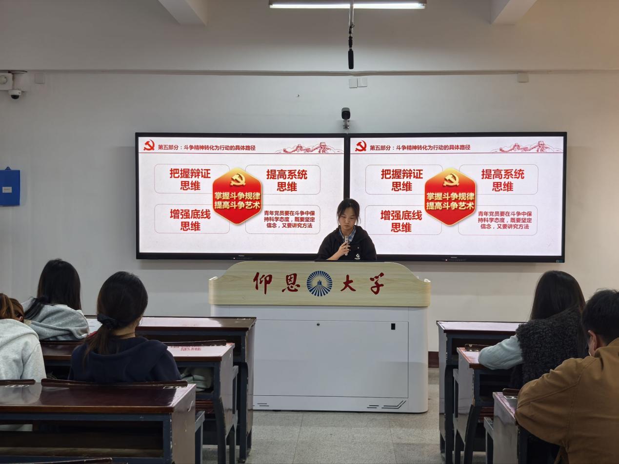 学习会伊始,支部干事连小凤同志梳理了毛泽东同志关于斗争的重要论述,结合抗美援朝战争、四渡赤水等经典案例,阐述“敢于斗争是勇气,善于斗争是智慧”的辩证关系。“一切反动派都是纸老虎”的论断与“零敲牛皮糖”的灵活战术相对照,让同学们深刻认识到,斗争既要具备“一不怕苦、二不怕死”的意志,更要掌握科学方法。