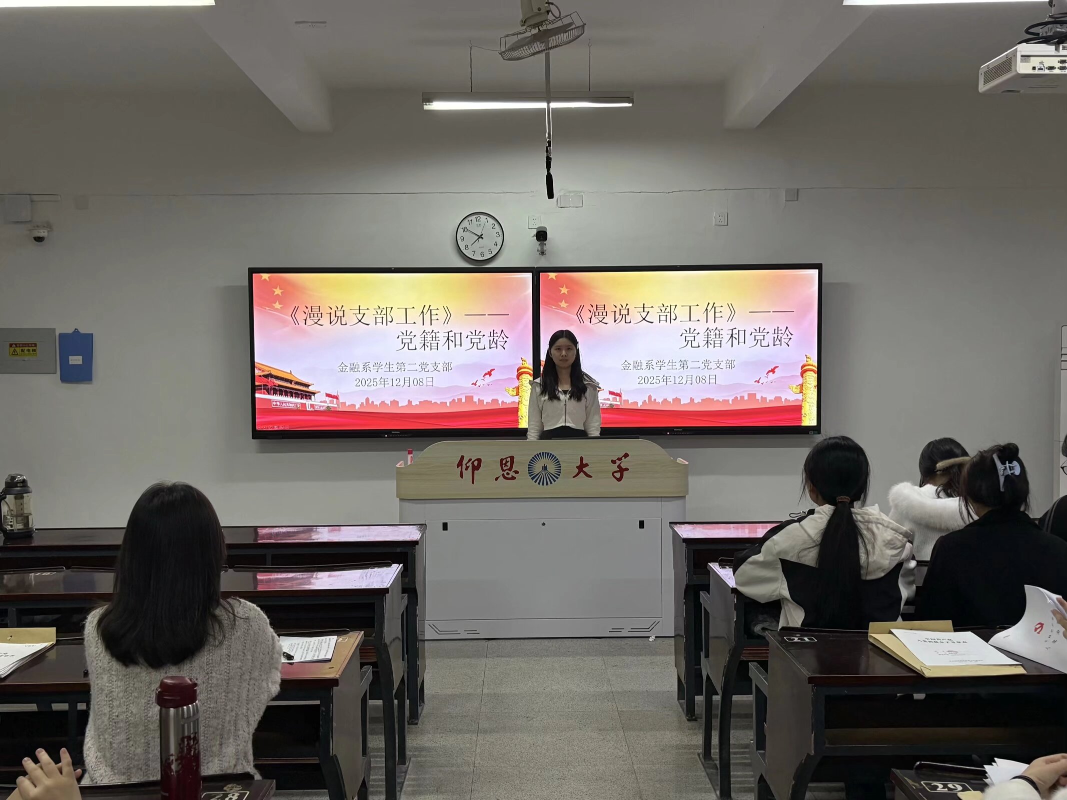 为进一步加强支部党员对党的基本常识的理解与掌握,规范支部组织生活,提升党员党性修养,2025年12月19日19:00,金融系学生第二党支部于仰恩楼C1-301开展“漫说支部工作——党籍和党龄”主题党课学习。支部书记邹丽雯主讲,支部全体党员、入党积极分子参加本次党课。