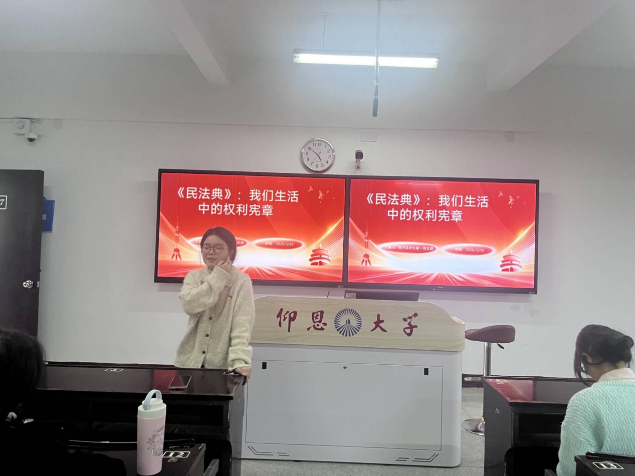 学习会上,支部书记首先阐述了《民法典》作为“社会生活的百科全书”和公民权利宪章的重大意义,强调其在推进全面依法治国、保障人民权益、维护社会公平正义中的核心作用。随后,通过PPT讲解与案例分析的方式,重点解读了与学生生活密切相关的法律条文:从个人信息与网络虚拟财产保护、见义勇为免责条款,到消费纠纷维权等内容,用“校园贷陷阱”“网购退货争议”等鲜活案例,让抽象的法律条文变得通俗易懂,帮助参会者深刻理解《民法典》如何从出生到终老全方位守护公民权利。在交流研讨环节,学生党员结合经济专业特色与生活实际踊跃发言,有党员谈到,学习后明确了兼职实习中的劳务合同权益边界,也懂得了如何运用法律武器应对消费欺诈;入党积极分子则表示,通过学习认识到《民法典》不仅是权利保障书,更是行为指南针,今后将自觉做到尊法学法守法用法。大家一致认为,作为新时代青年党员,既要熟练运用法律知识维护自身合法权益,也要主动向身边同学普及法治理念,成为法治精神的传播者。